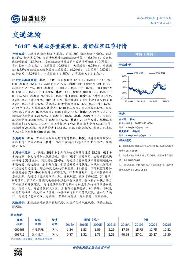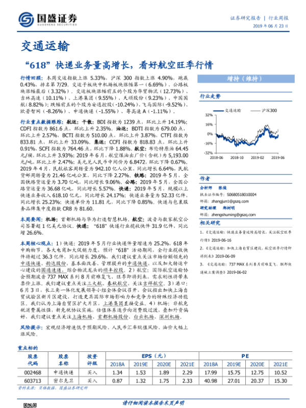 【国盛证券】【20190623】交通运输行业周报:“618”快递业务量高增长,看好航空旺季行情-17页
