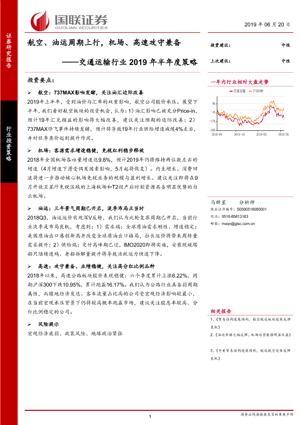 【国联证券】【20190620】交通运输行业2019年半年度策略:航空、油运周期上行,机场、高速攻守兼备-19页
