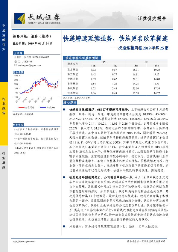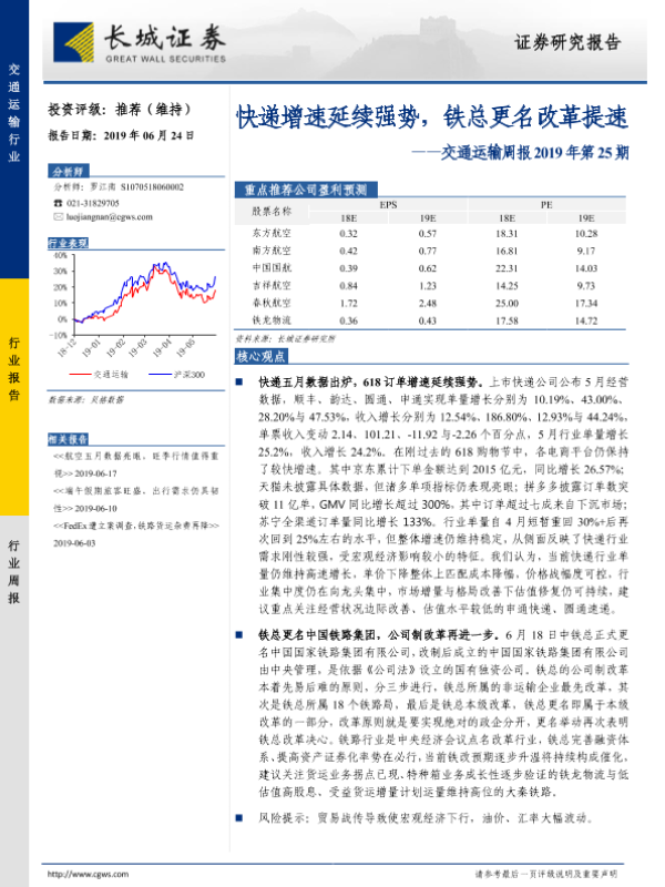 【长城证券】【20190624】快递增速延续强势,铁总更名改革提速-20页