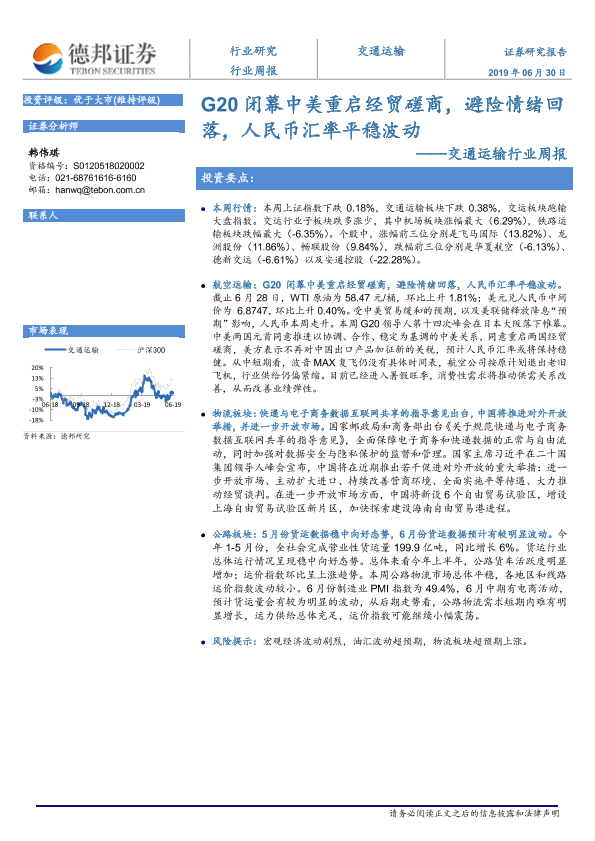 交通运输 人民币汇率 经贸磋商 证券研究 避险情绪