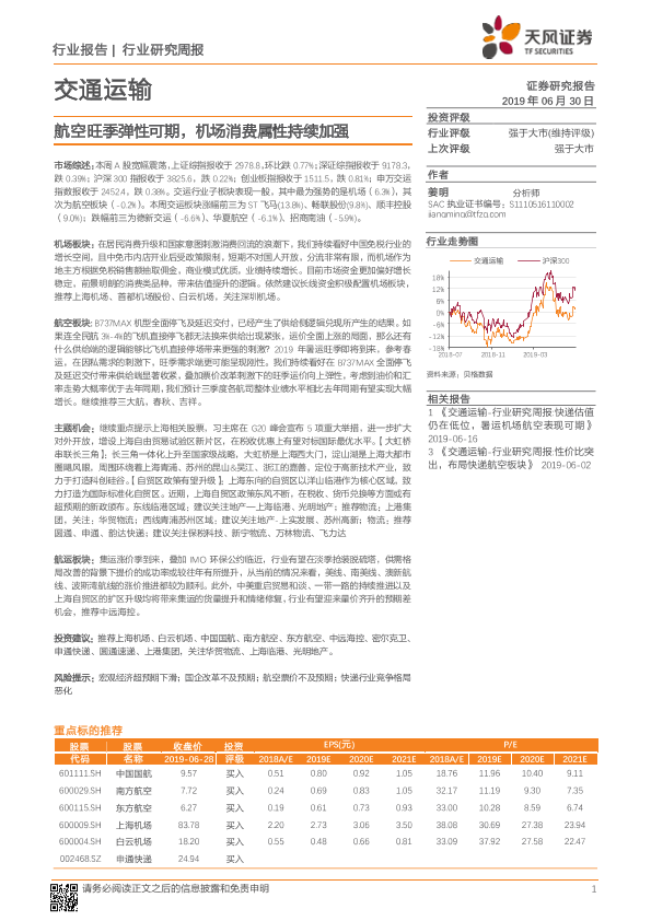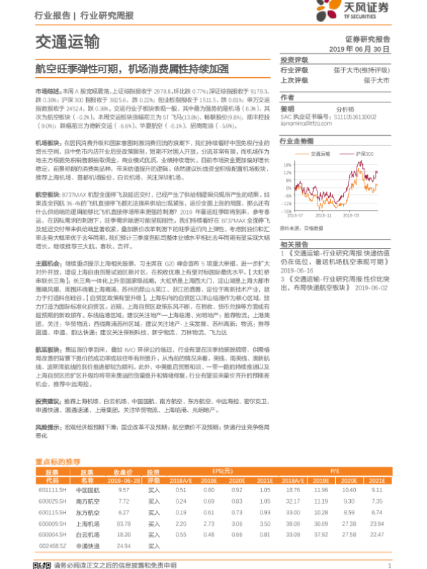 【天风证券】【20190630】交通运输行业研究周报:航空旺季弹性可期,机场消费属性持续加强-13页