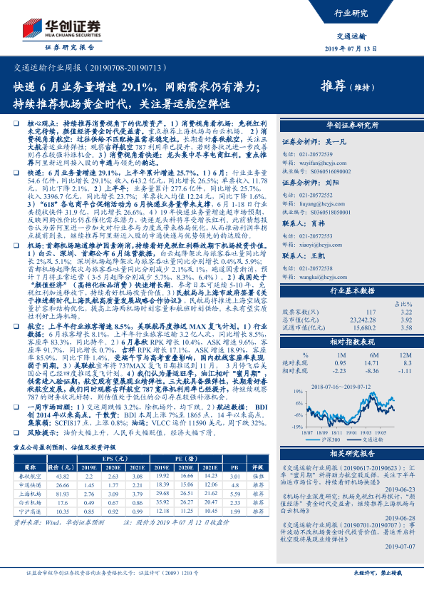 【华创证券】【20190713】交通运输行业周报:快递6月业务量增速29.1%,网购需求仍有潜力;持续推荐机场黄金时代,关注暑运航空弹性-12页
