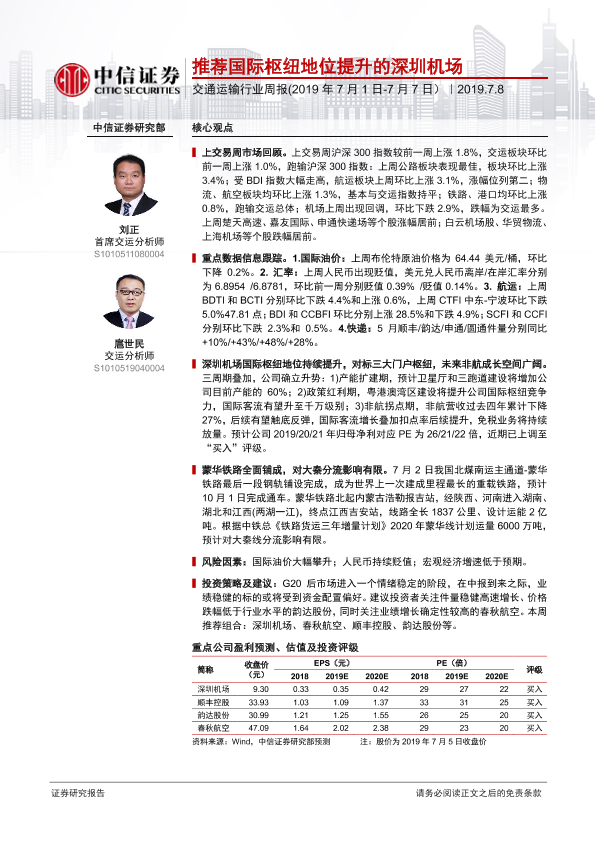 【中信证券】【20190708】交通运输行业周报:推荐国际枢纽地位提升的深圳机场-23页
