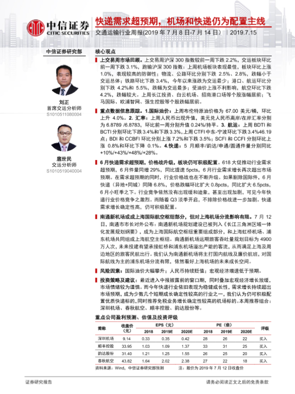 【中信证券】【20190715】交通运输行业周报:快递需求超预期,机场和快递仍为配置主线-24页