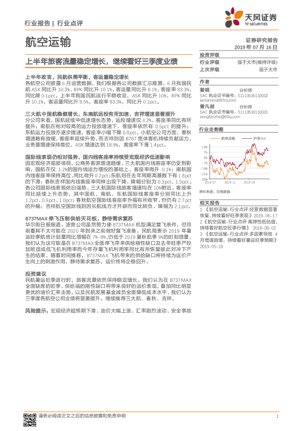 【天风证券】【20190716】上半年旅客流量稳定增长,继续看好三季度业绩-5页