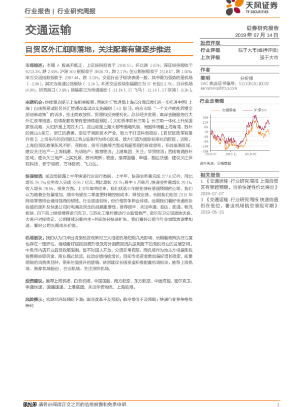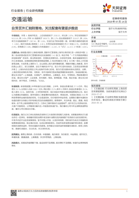 【天风证券】【20190714】交通运输行业研究周报:自贸区外汇细则落地,关注配套有望逐步推进-12页
