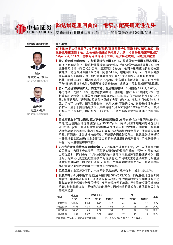 【中信证券】【20190719】交通运输行业快递公司2019年6月经营数据点评-2页