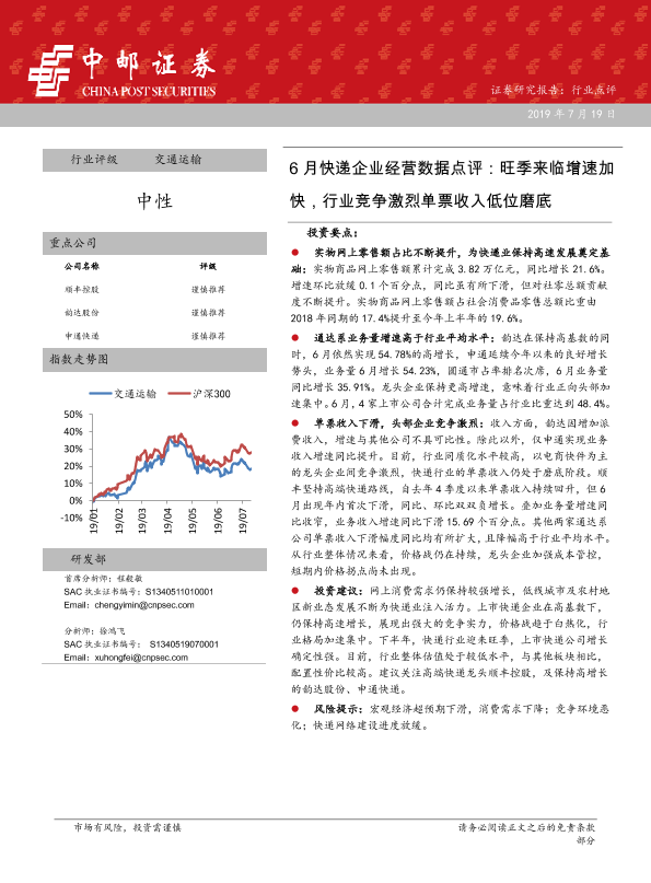 【中邮证券】【20190719】6月快递企业经营数据点评:旺季来临增速加快,行业竞争激烈单票收入低位磨底-11页
