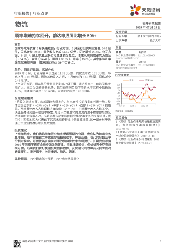 【天风证券】【20190719】物流行业点评:顺丰增速持续回升,韵达申通同比增长50%+-7页