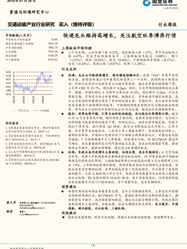 【国金证券】【20190720】交通运输产业行业研究:快递龙头维持高增长,关注航空旺季博弈行情-22页