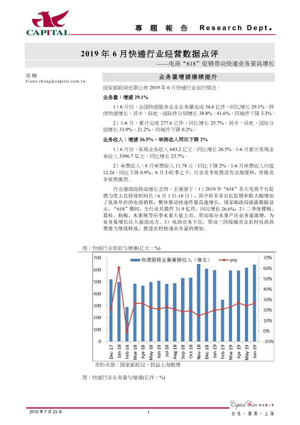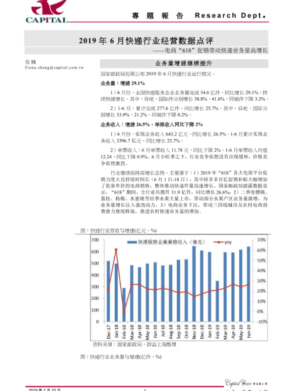 【群益证券】【20190723】2019年6月快递行业经营数据点评:电商“618”促销带动快递业务量高增长-6页