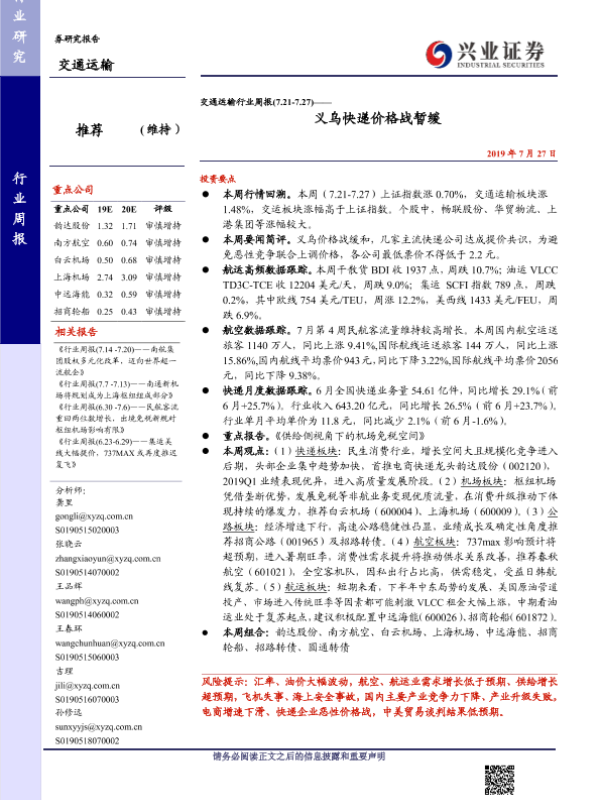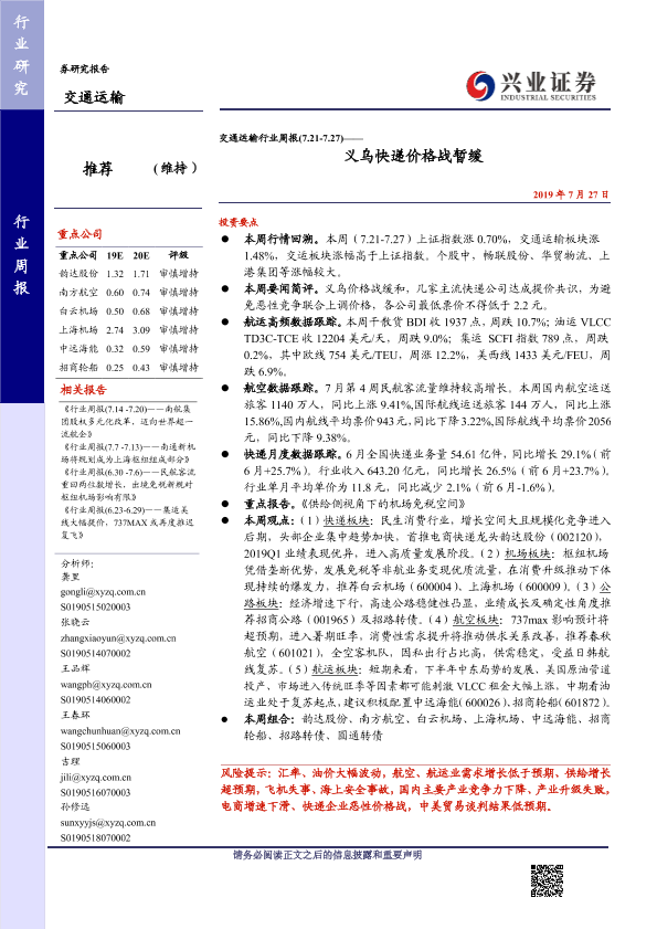 【兴业证券】【20190727】交通运输行业周报:义乌快递价格战暂缓-15页