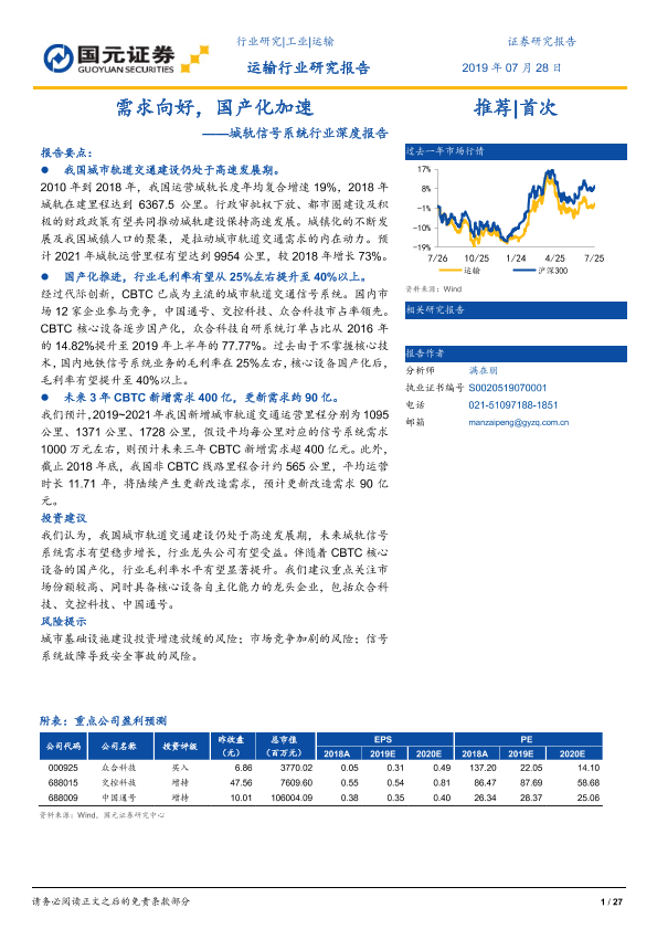 【国元证券】【20190728】城轨信号系统行业深度报告:需求向好,国产化加速-27页