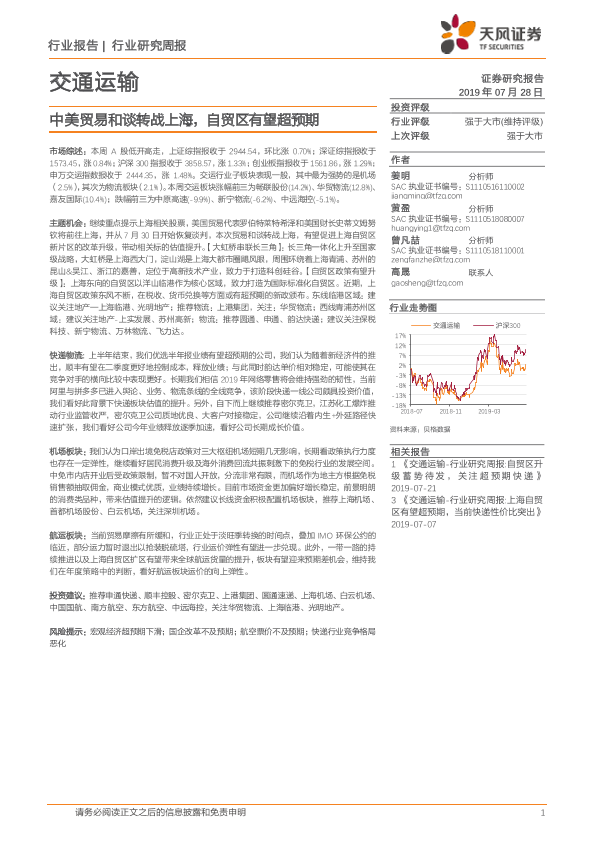 【天风证券】【20190728】交通运输行业研究周报:中美贸易和谈转战上海,自贸区有望超预期-13页