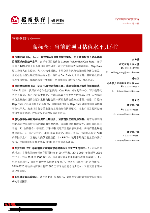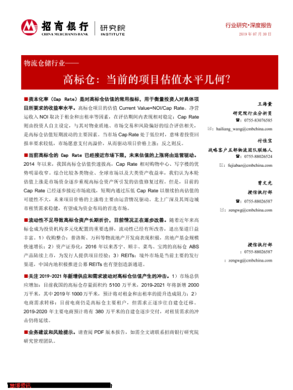 【招商银行】【20190730】物流仓储行业——高标仓:当前的项目估值水平几何?-20页