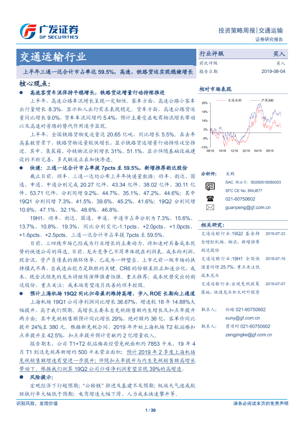 【广发证券】【20190804】交通运输行业:上半年三通一达合计市占率达59.5%,高速、铁路货运实现稳健增长-39页