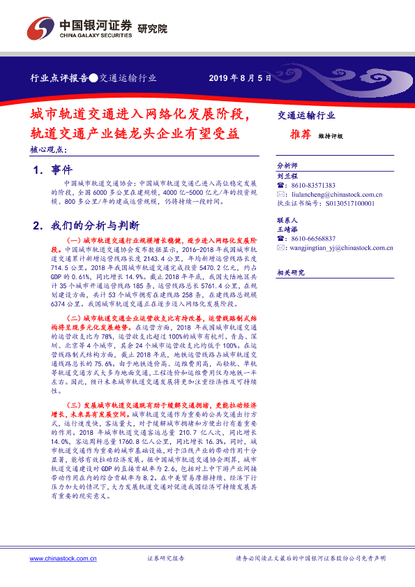 【银河证券】【20190805】城市轨道交通进入网络化发展阶段,轨道交通产业链龙头企业有望受益-4页