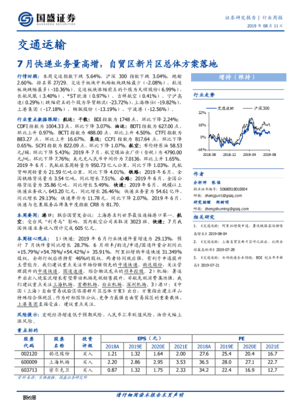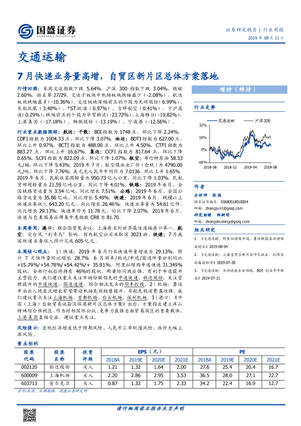 交通运输 快递业务 自贸区 行业周报 证券研究报告