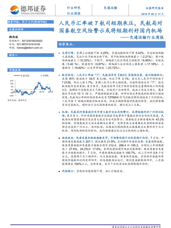 【德邦证券】【20190811】人民币汇率破7航司短期承压,民航局对国泰航空风险警示或将短期利好国内机场-12页