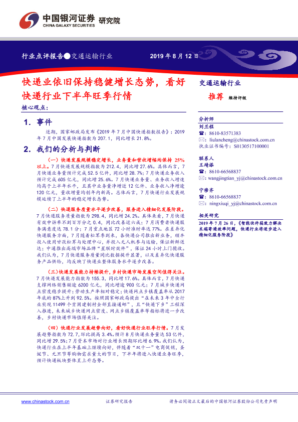 【银河证券】【20190812】交通运输行业:快递业依旧保持稳健增长态势,看好快递行业下半年旺季行情-4页