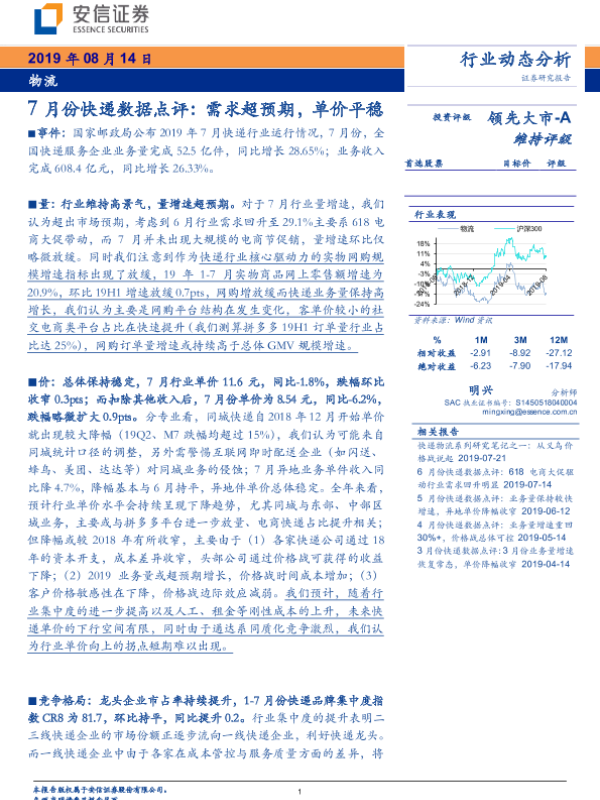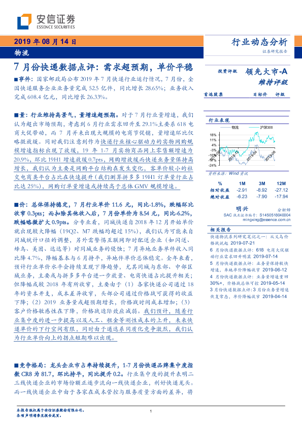 【安信证券】【20190814】7月份快递数据点评:需求超预期,单价平稳-10页