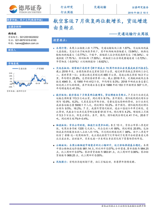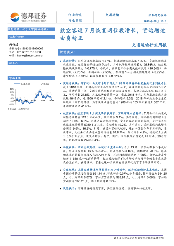 【德邦证券】【20190818】航空客运7月恢复两位数增长,货运增速由负转正-12页