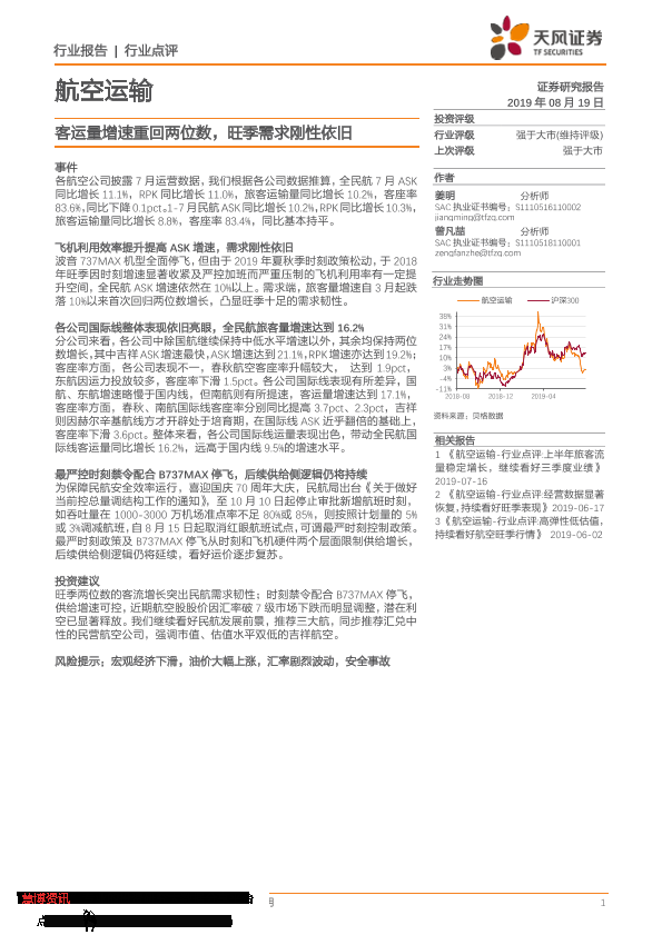 【天风证券】【20190819】航空运输行业点评:客运量增速重回两位数,旺季需求刚性依旧-2页