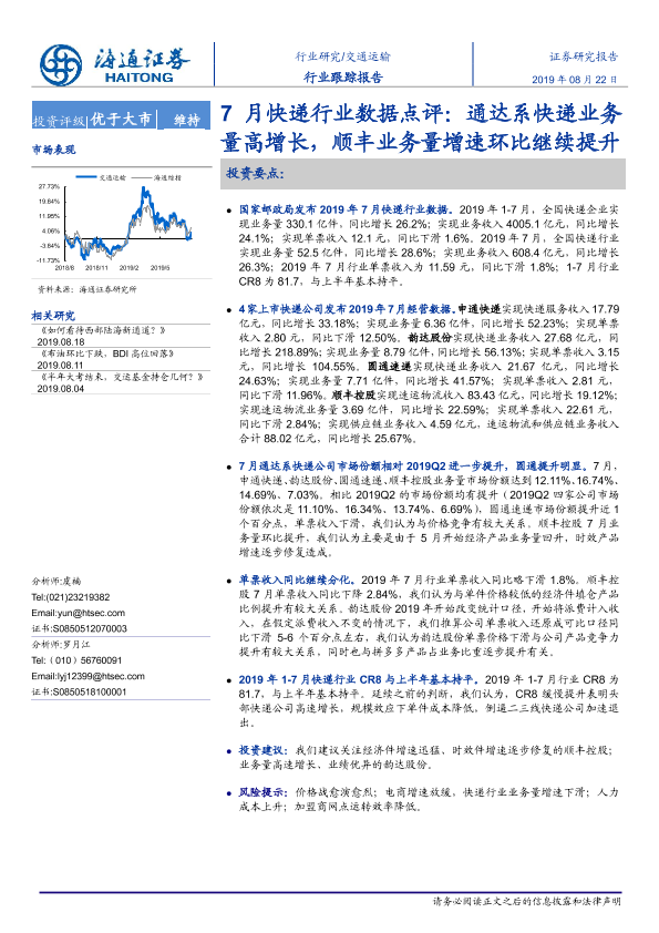 【海通证券】【20190822】7月快递行业数据点评:通达系快递业务量高增长,顺丰业务量增速环比继续提升-4页