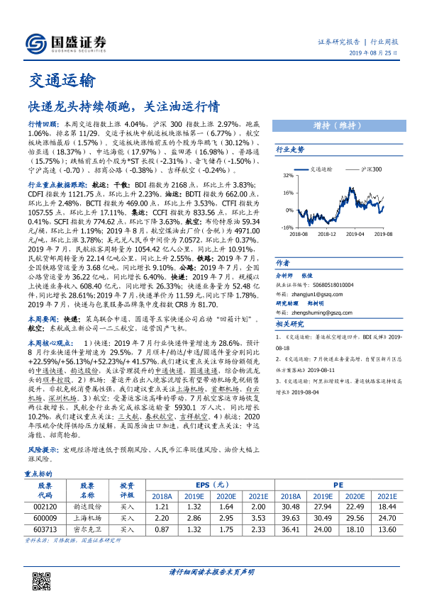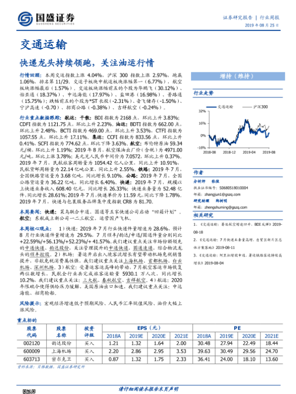 【国盛证券】【20190825】交通运输行业周报:快递龙头持续领跑,关注油运行情-17页