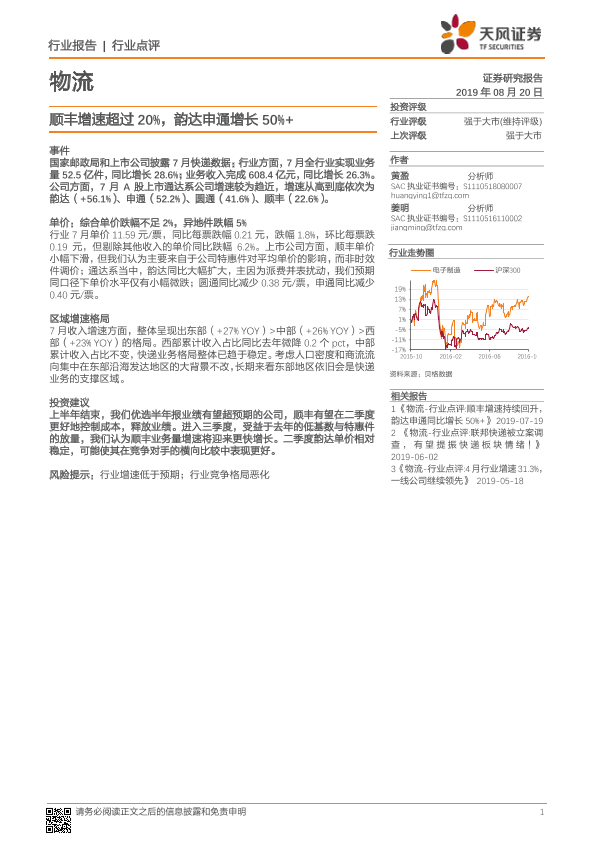 【天风证券】【20190820】物流行业点评:顺丰增速超过20%,韵达申通增长50%+-7页