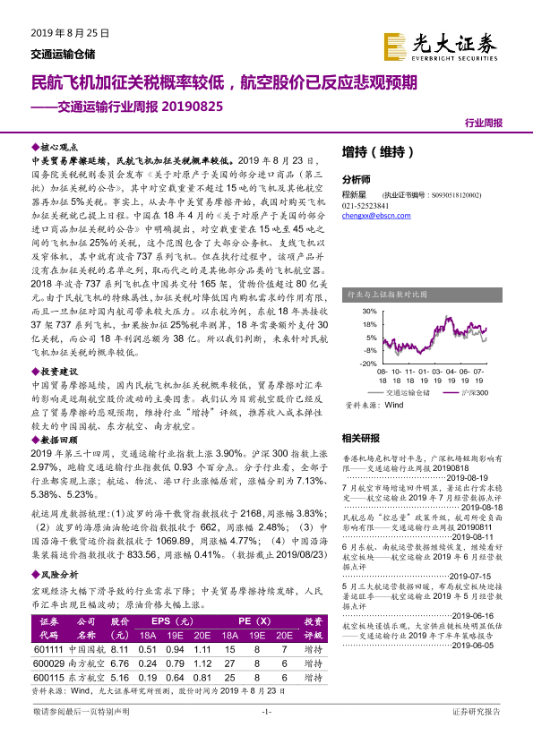 【光大证券】【20190825】交通运输行业周报:民航飞机加征关税概率较低,航空股价已反应悲观预期-7页