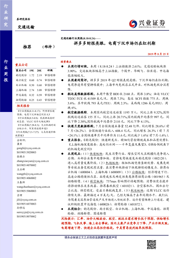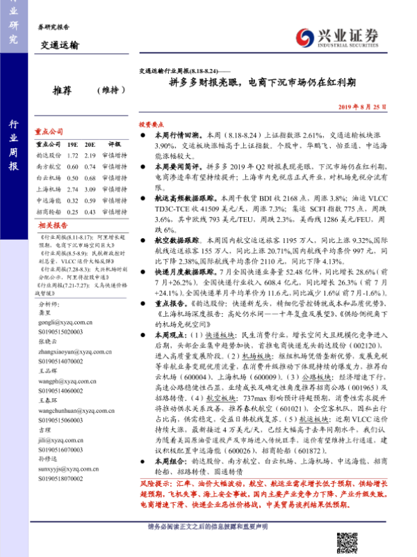【兴业证券】【20190825】交通运输行业周报:拼多多财报亮眼,电商下沉市场仍在红利期-18页