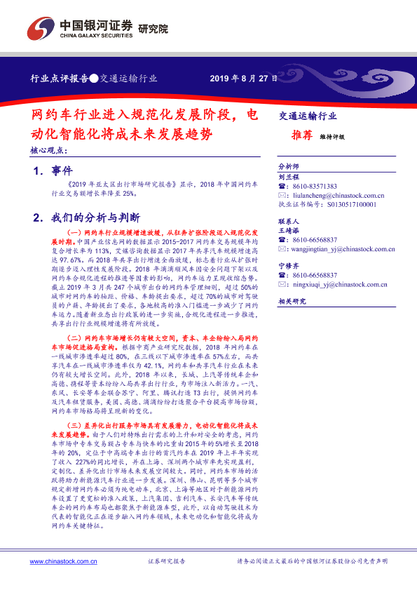 【银河证券】【20190827】交通运输行业:网约车行业进入规范化发展阶段,电动化智能化将成未来发展趋势-4页