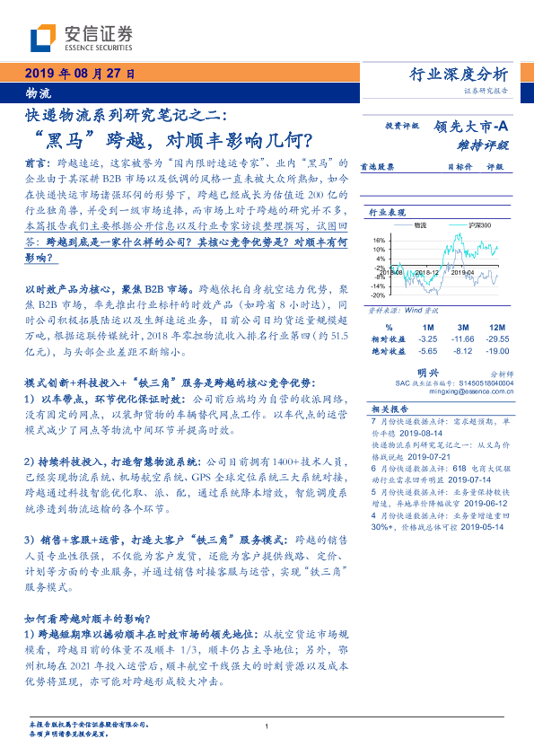 【安信证券】【20190827】快递物流系列研究笔记之二:“黑马”跨越,对顺丰影响几何?-15页