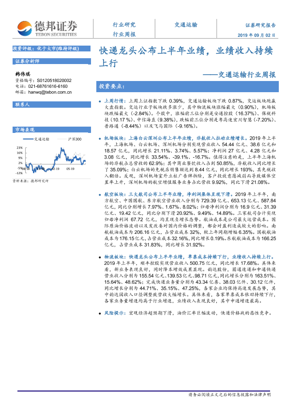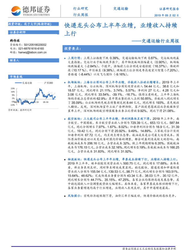 【德邦证券】【20190902】快递龙头公布上半年业绩,业绩收入持续上行-13页