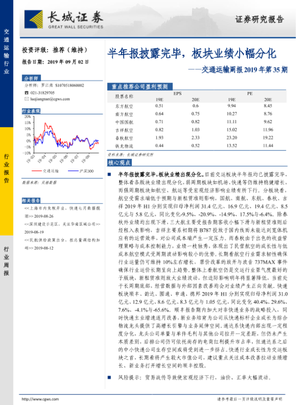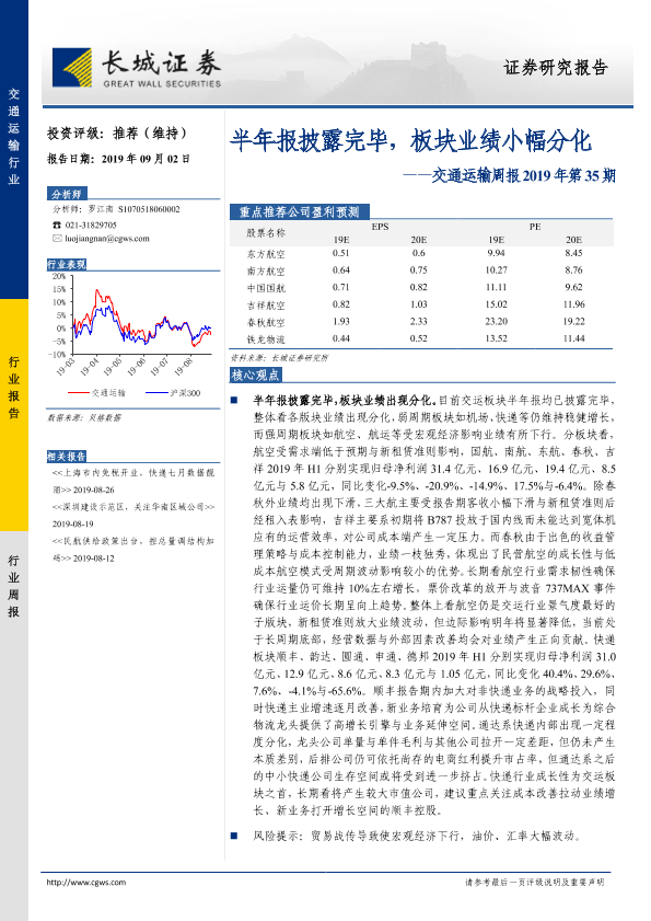 【长城证券】【20190902】交通运输周报2019年第35期:半年报披露完毕,板块业绩小幅分化-21页