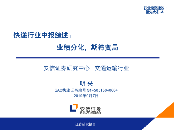 【安信证券】【20190907】快递行业中报综述:业绩分化,期待变局-27页