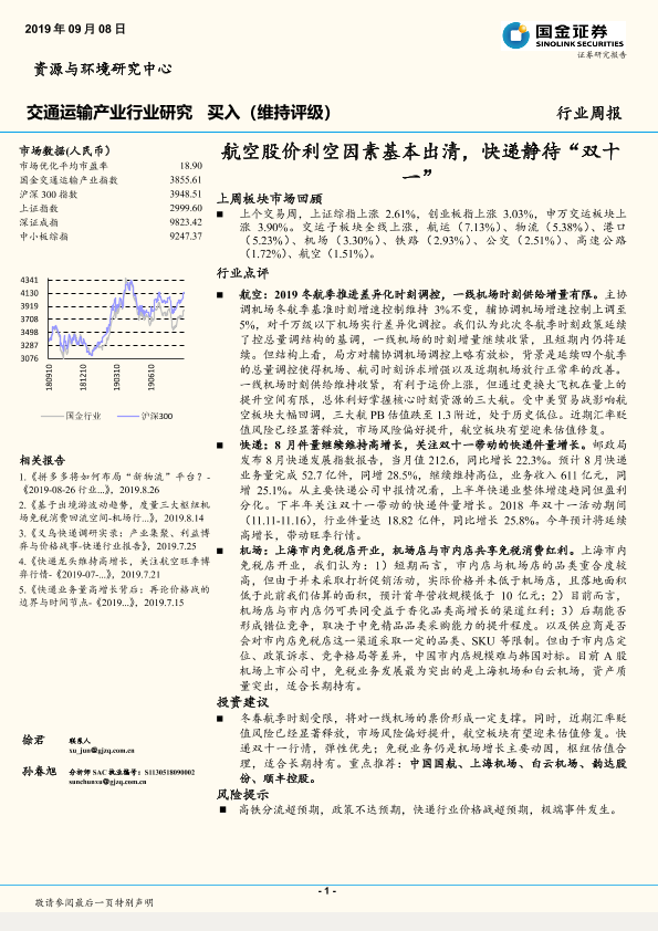【国金证券】【20190908】交通运输产业行业研究周报:航空股价利空因素基本出清,快递静待“双十一”-16页