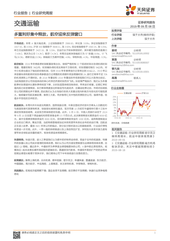 【天风证券】【20190908】交通运输行业研究周报:多重利好集中释放,航空迎来反弹窗口-26页