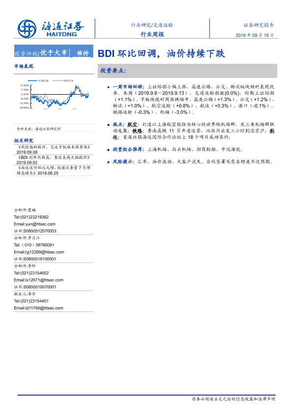 【海通证券】【20190915】交通运输行业周报:BDI环比回调,油价持续下跌-7页