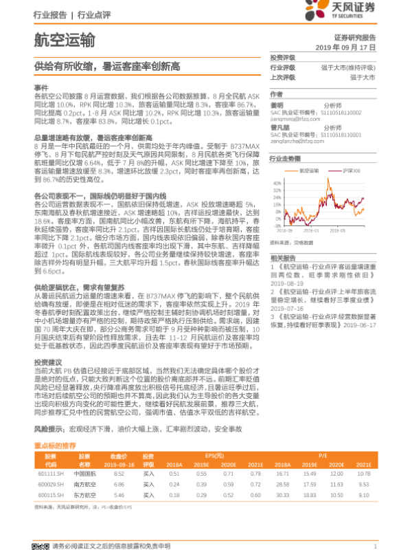 【天风证券】【20190917】航空运输行业点评:供给有所收缩,暑运客座率创新高-5页