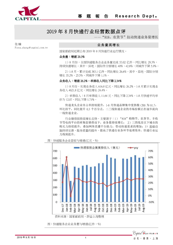 【群益证券】【20190919】2019年8月快递行业经营数据点评:“818、农货节”拉动快递业务量增长-6页
