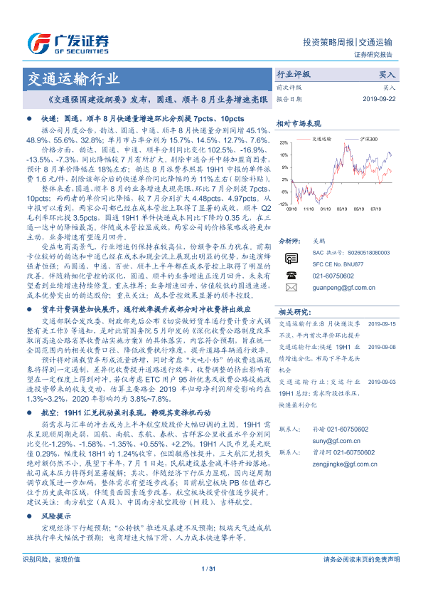 【广发证券】【20190922】交通运输行业投资策略周报:《交通强国建设纲要》发布,圆通、顺丰8月业务增速亮眼-31页