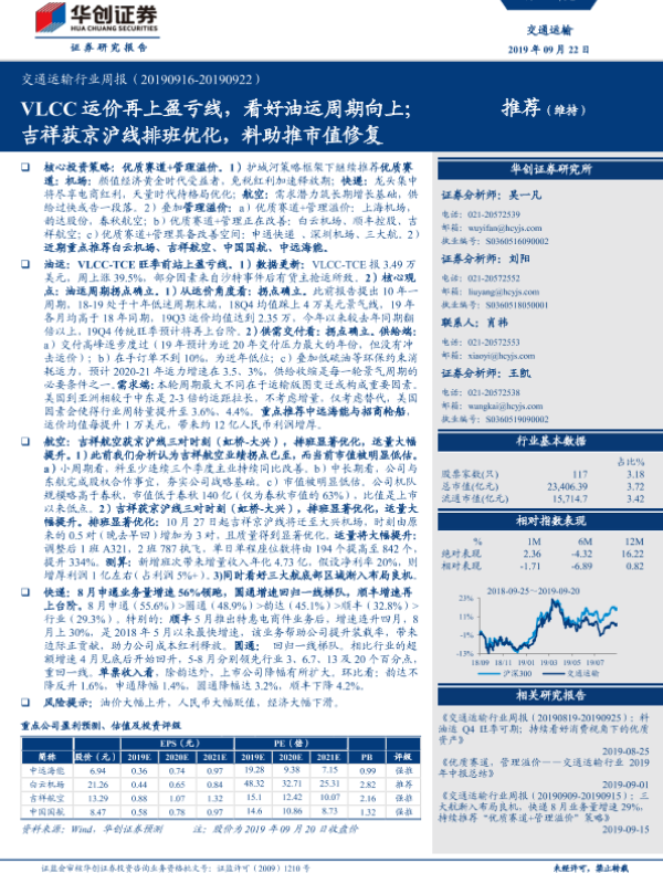 【华创证券】【20190922】交通运输行业周报:VLCC运价再上盈亏线,看好油运周期向上;吉祥获京沪线排班优化,料助推市值修复-15页
