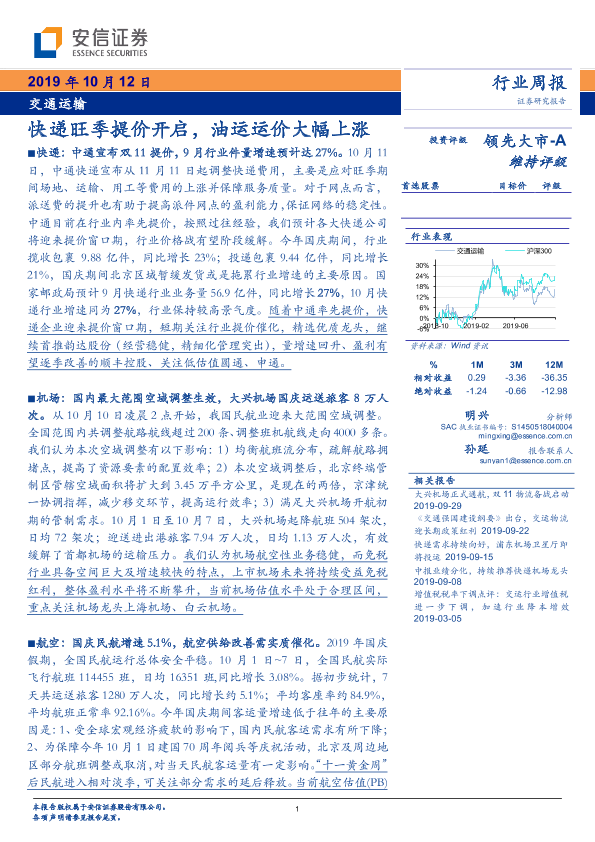 【安信证券】【20191012】交通运输行业周报:快递旺季提价开启,油运运价大幅上涨-17页