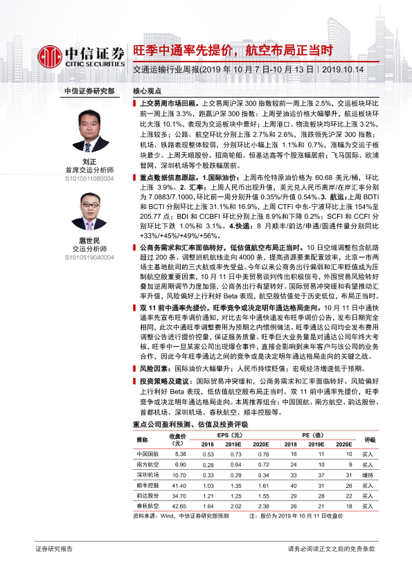 【中信证券】【20191014】交通运输行业周报:旺季中通率先提价,航空布局正当时-25页