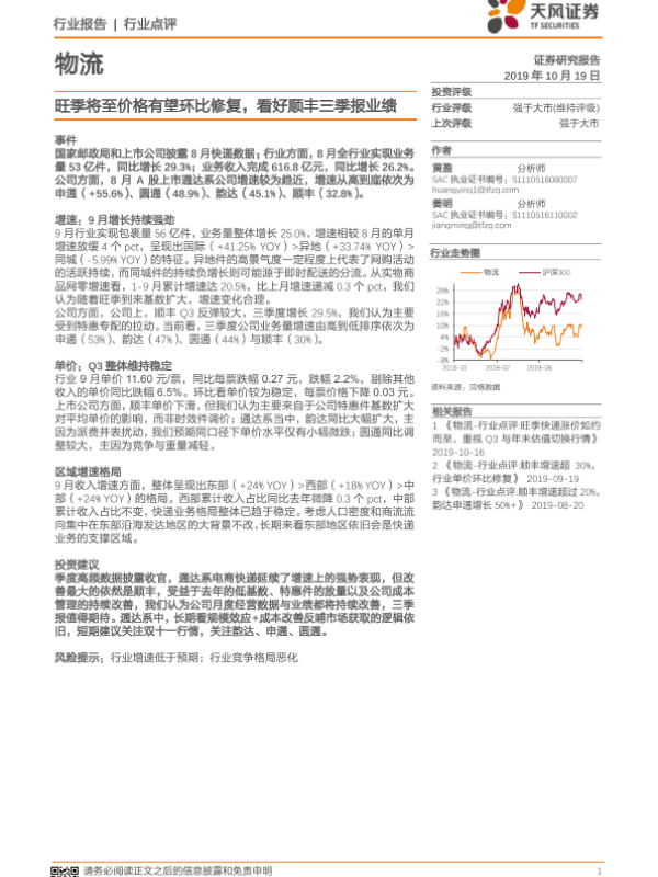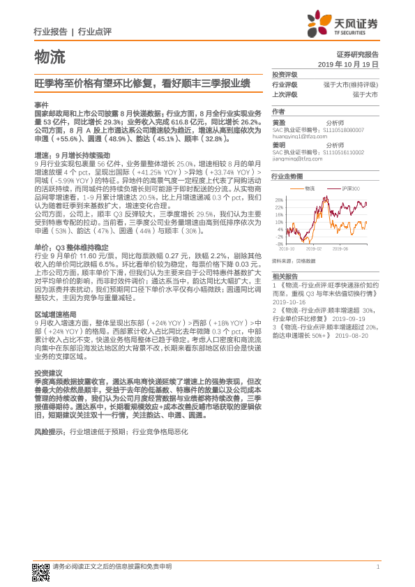 【天风证券】【20191019】旺季将至价格有望环比修复,看好顺丰三季报业绩-7页