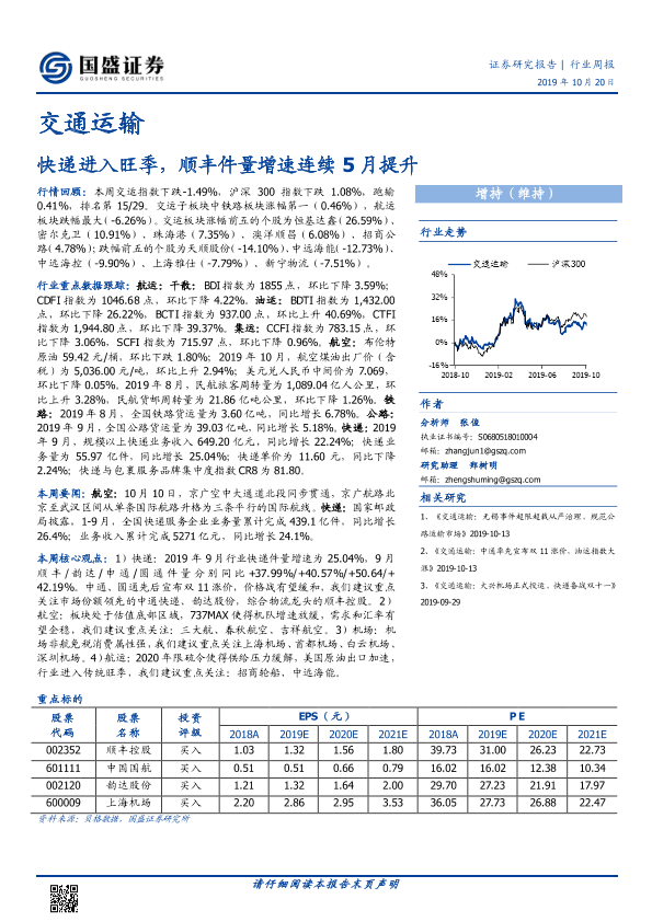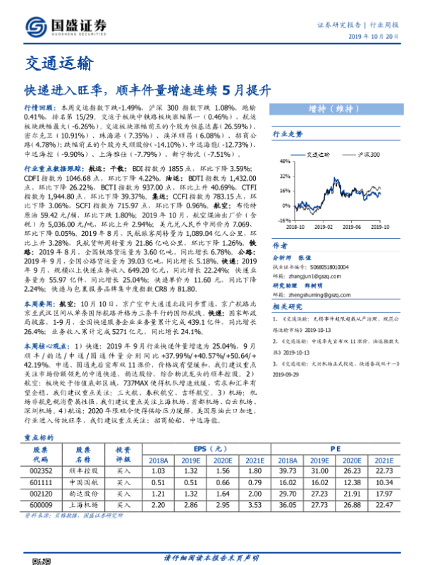 【国盛证券】【20191020】交通运输行业周报:快递进入旺季,顺丰件量增速连续5月提升-18页