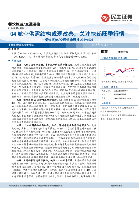 【民生证券】【20191021】Q4航空供需结构或现改善,关注快递旺季行情-15页