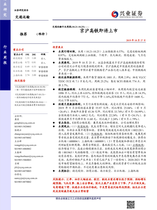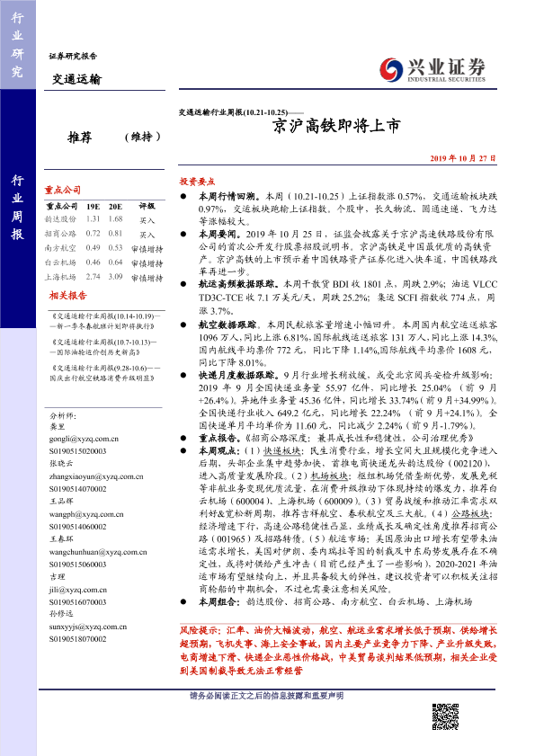 【兴业证券】【20191027】交通运输行业周报:京沪高铁即将上市-14页